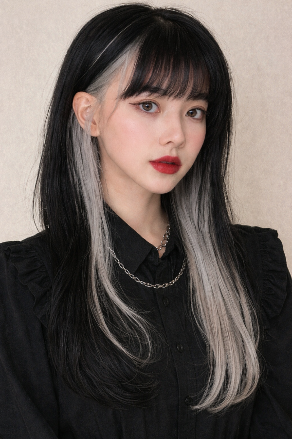 머리를 넘기거나 묶었을 때 안쪽에 들어간 밝은 애쉬블론드 컬러가 은은하게 드러나는 디자인 컬